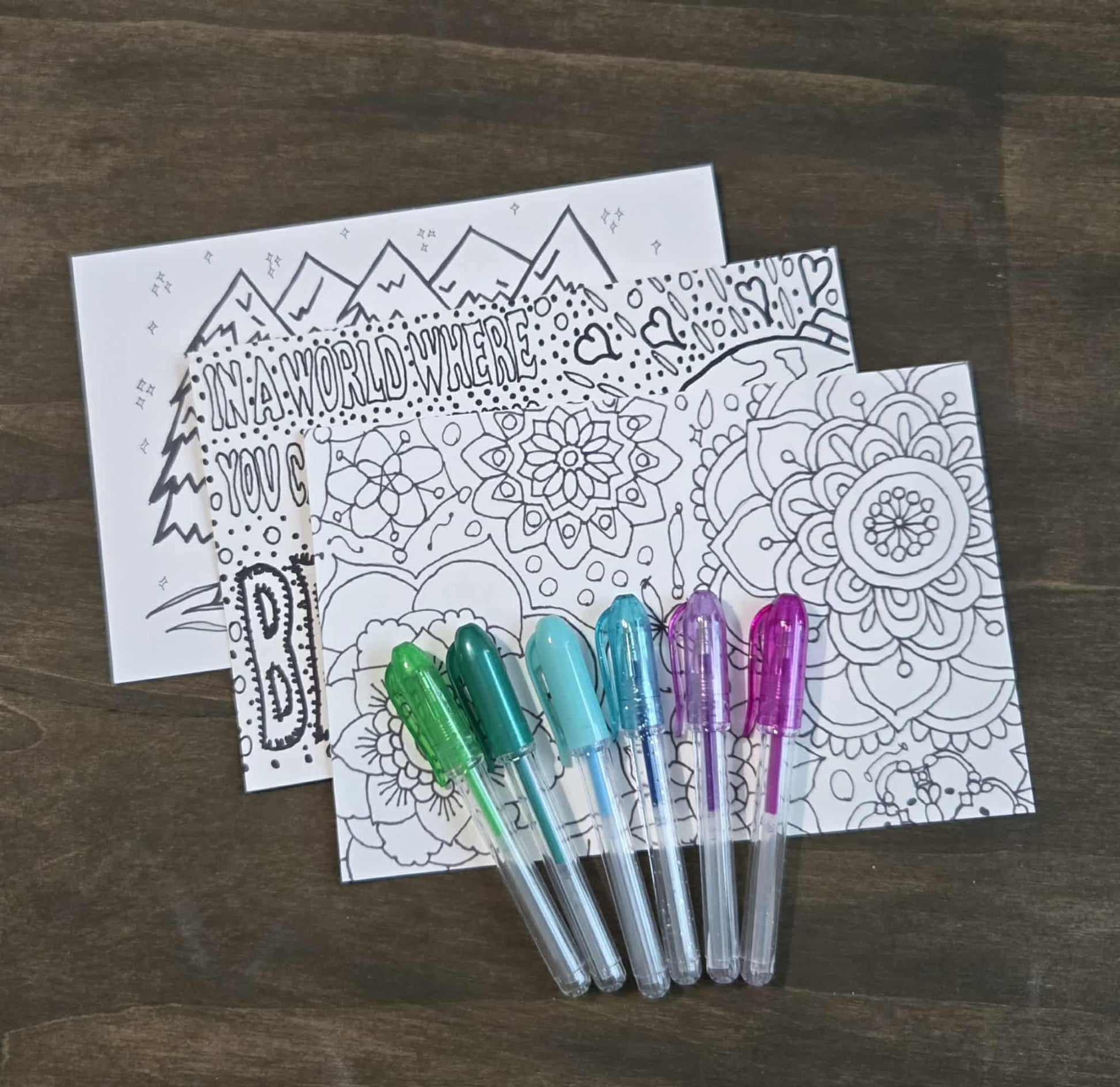 - Six vibrant miniature gel pens, selected specifically for smooth, detailed coloring and a harmonious color palette